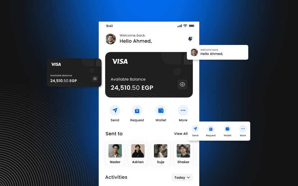 • Quick actions for sending money, requesting payments, and accessing the wallet